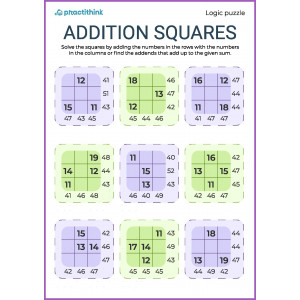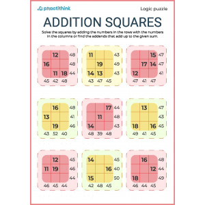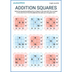 The child needs to fill in empty cells in 3x3-cells squares that already contain numbers from 1 to 29, in accordance with the sums of the numbers horizontally and vertically.