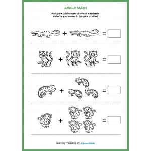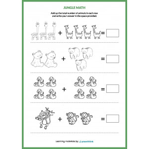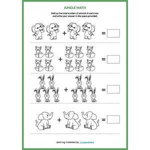 Out worksheets provide several tasks on each page. Kids need to add up the total number of animals in each row and write the answer in the space provided.