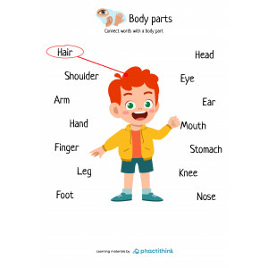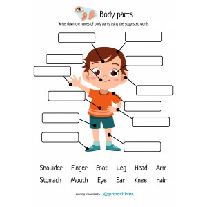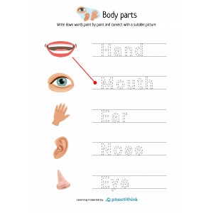 These learning pages contain few exercises for practicing. Doing the first set children need to write down the names of body parts using the suggested words. The second set offers words of body parts, which children need to write down in the white squares. Another activity provides words that children need to write by points and connects them with a suitable picture.