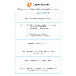 These printable worksheets are the perfect learning activity that helps a child use the uppercase letters correctly. Practicing with these resources, students need to locate the word that starts with a capital letter and circle it.