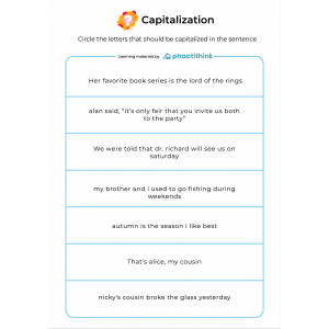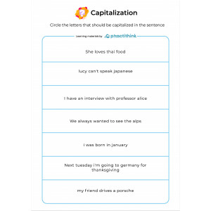 On each worksheet, children are offered seven sentences on different topics with a different number of required capital letters. To add extra challenge you can set the time (1-3 minutes) to let students find and circle the words.