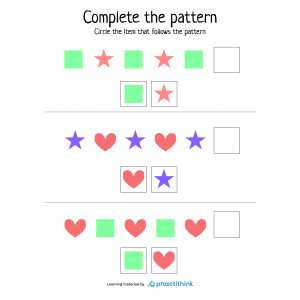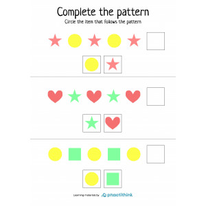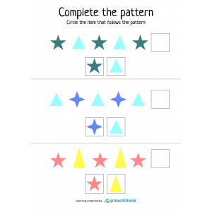 These printable worksheets are the perfect learning activity that helps a child get comfortable with analyzing sequences and finding patterns. Each worksheet contains three rows of patterns. Practicing with these resources children need to complete the sequence of shapes.