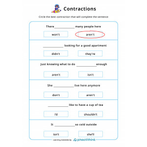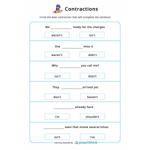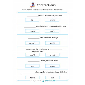 The worksheets provide tasks in finding the right form of contraction. Students need to circle the best contraction that will complete the sentence.