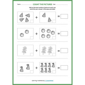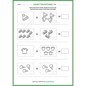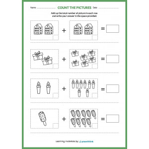 Ask the children to count the items in each square and put the corresponding number in a small window, and then write the total amount.