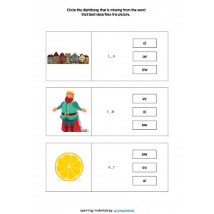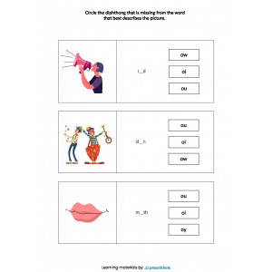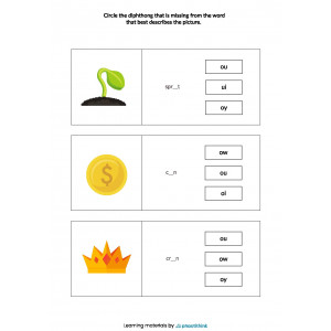 These printable worksheets are handy for students learning English and working out on diphthongs. The concept of two or more letters spelling a single sound or two sounds coming together to create a new sound (diphthongs) can be pretty challenging for students. Each word in these printable worksheets is missing two letters. Children need to figure out the word by looking at each picture and then choose oi, oy, ou, and ow to fill in the missing letters. This worksheet helps kids practice recognizing and using spelling patterns such as diphthongs (two vowel sounds in one syllable) when reading and decoding. Most of the words used in these learnings activities are sight words and help young students practice reading and recognition skills. Secondary usage: Write the whole word under the word you just figured out. Think of a short sentence you can use this word; write it below. Cross-out wrong suggestions. Approximate US School Grade: 2nd Grade, 3rd Grade Age Range: 6-8
