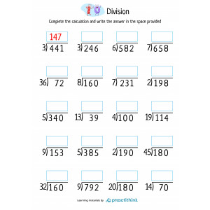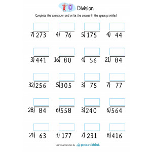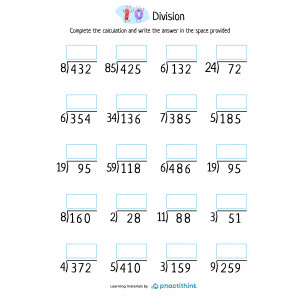 These printable worksheets are the perfect learning activity to help children become comfortable with performing long division. Practicing with these resources, students need to divide a dividend, which is already placed under a division bar, by a divisor, which is already put outside the bar, and write the answer above, in the space provided.
