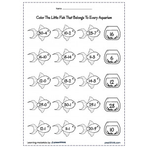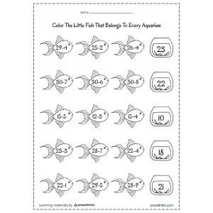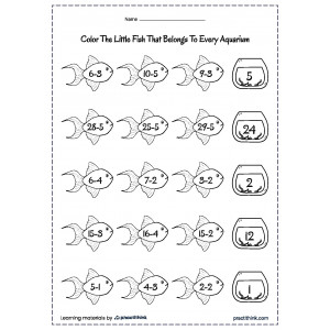 In this task, you see three fish in each line. An example is written on each fish, having solved it, the child should choose the fish which example corresponds to the answer in the aquarium. Give children colored pencils to make this task more interesting and turn into a game.
