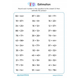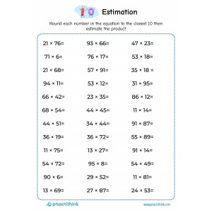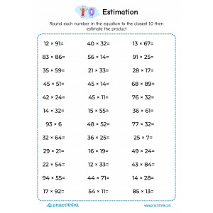 These printable worksheets are the perfect learning activity that helps a child learn how to estimate the product of multiplying numbers. Practicing with these resources, students need to round each number in the estimation to the closest 10, then perform some mental arithmetic and write the estimated product.