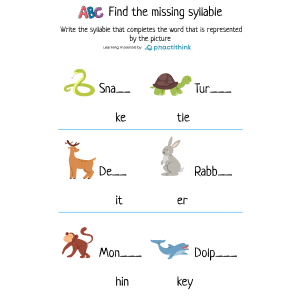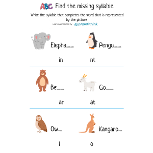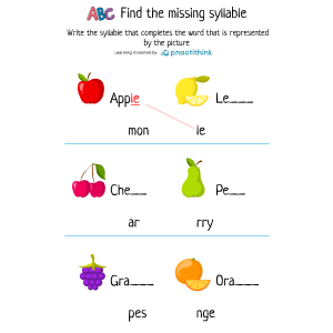 Children figure out what the picture represents, then decide which syllable should be added to that provided to form the word that is described by the picture. Children will be offered two images and two syllables. They need to think logically and connect the image and the missing word. This worksheet will help children understand how syllables are used to form words.