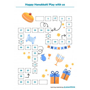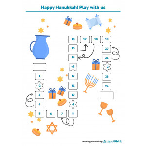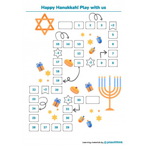 How to apply these worksheets? You may use this activity on the run-up to Hanukkah at school or when celebrating with family. To play the game, get ready some dice and counters. If you don't have counters at hand, use coins, sweets, erasers, or any small objects. Dice can be made of a paper or wooden cube with dots. Kids take turns rolling the dice and moving their counters. The winner is the first player who reaches the final point.