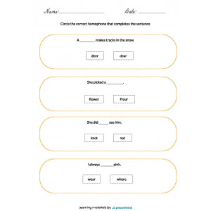 Our worksheets provide a set of tasks. There are several sentences on each page. Children need to circle the correct homophones to complete the sentences. Also, you may challenge your kids to make a list of other homophone pairs.