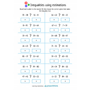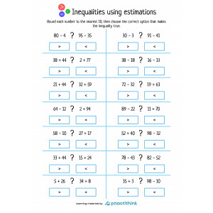 We have prepared this set of fun learning pages to help 9-10 years old children practice solving inequalities using estimations. By using these worksheets, young learners will improve their math knowledge enjoyably.