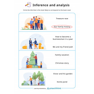 These pages contain few tasks. Children need to analyze the given information and find clues about what this book may contain. Having found the clues students need to circle the title. This title has to be the most likely to correspond to the book cover.