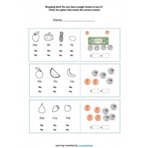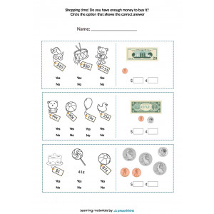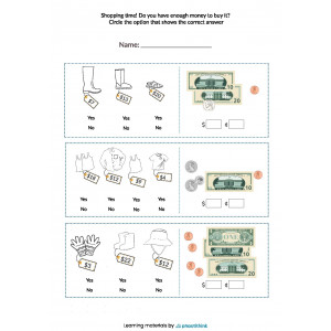 These pages offer several tasks. In every task, a child needs to find out if they have enough money to buy a given thing. Then they need to circle the option that shows the correct answer. Also, they can write down the amount of money shown in the picture.