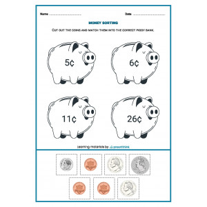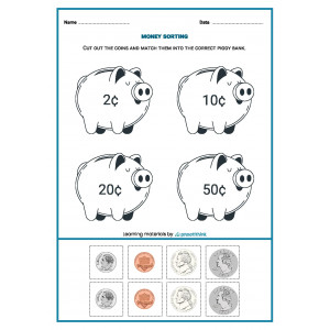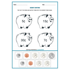 Each worksheet has piggy banks with a certain amount of money, which it can hold before it is full. Each worksheet has the necessary number of coins at the bottom of the page.