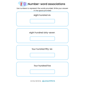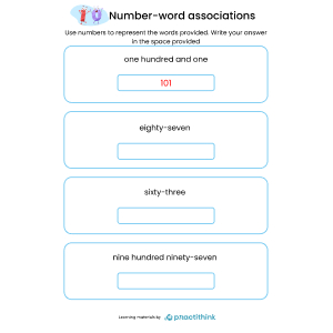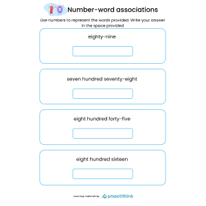 A handy set of practice worksheets that help you children to write and remember the spellings for numbers one to one thousand. Children first determine what number is provided then write the answer by using their number-word association ability. This worksheet will help kids with associating numbers to words and vice versa. This is a very important skill and children should know how to write every number in words. This worksheet requires students to find meaning the word in numbers.