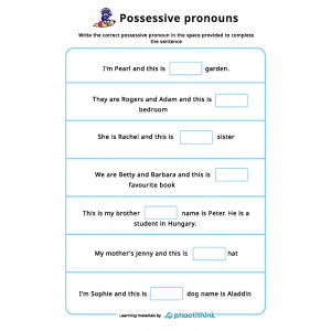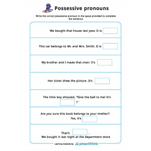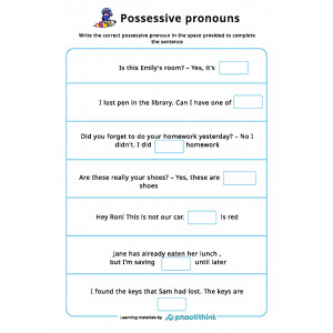 These printable worksheets are the perfect learning activity for helping a child get comfortable with possessive pronouns. Practicing with these resources, students need to decide which possessive pronoun is the most suitable and complete the sentence with it.