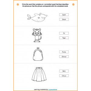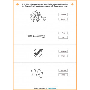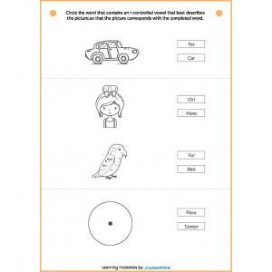These learning pages will help children to practice their skills in using r-controlled vowels. Doing these exercises they need to choose the word with an r-vowel that best describes the picture, so that the picture corresponds to the completed word.