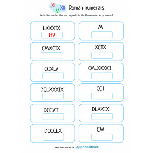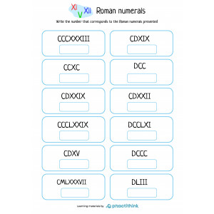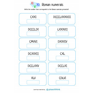 In these learning pages children are proposed to decipher Roman numerals up to 1000. Practicing with these worksheets children will practice mental arithmetic, their addition, and multiplication skills.