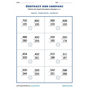 This task is a complicated version of the comparison exercises that we have already added before («Comparing 3-digit numbers») and opposite to “Add and compare”. Here, it is necessary not just to put the signs more and less, but before that, also perform the column subtraction. By mastering these concepts, students improve their number sense and recognize relationships between numbers easier.