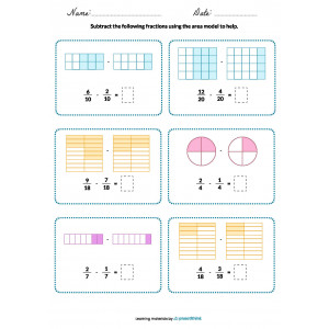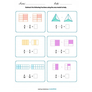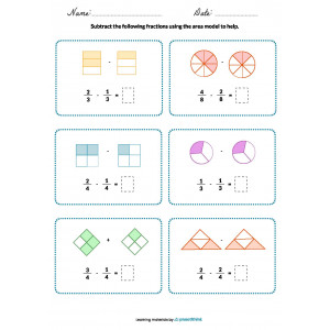 Our worksheets provide several exercises on each page. The pictures shown will help children visualize the fractions when performing the operations. Students need to look at the area model, subtract fractions and write down the answer in the space provided.