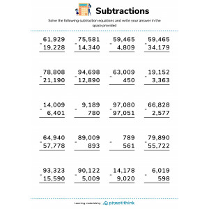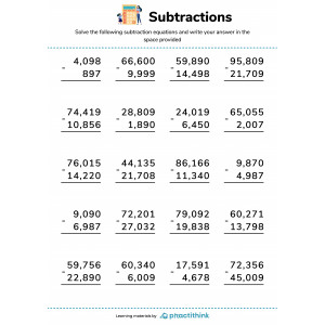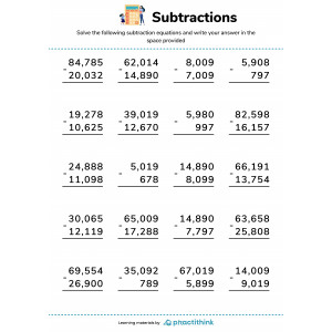 These printable worksheets are the perfect learning activity to help children become confident in subtracting five-digit numbers. Practicing with his resources, students need to subtract a smaller number from a larger one and write the difference in the box provided.