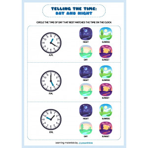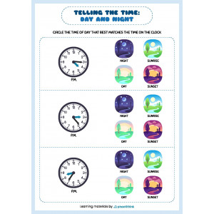 These printable worksheets are the perfect learning activity that helps a child identify the time of the day and get comfortable with telling the time looking at an analog clock. Practicing with these resources, students need to read time from a clock, check for AM or PM at the bottom, and circle the correct option: morning, day, evening, or night.