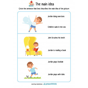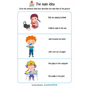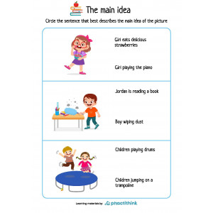 These printable worksheets will help your kids determine the main idea. Each page offers a set of pictures. Children need to look at the illustration, identify the main idea, and circle the sentence that best describes the illustrated situation.