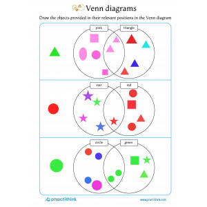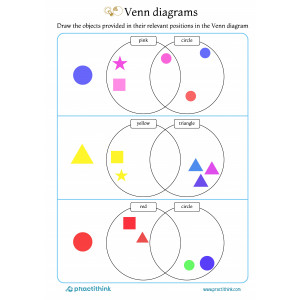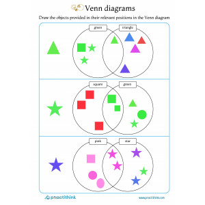 Our printables provide a set of tasks on each page. Children need to draw the objects in a Venn Diagram according to the sort criteria.
