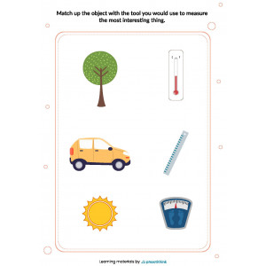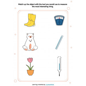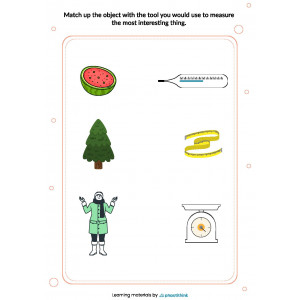 To add more variety, cut the worksheets into cards, mix them and ask children to match an object to a measuring tool. Older students take only cards with tools. Ask them to work in groups or individually and think of two, three, or more objects that can be measured with this. In another version of a game with cards, take only one object and place several measuring tools in front of a child or a group of children. Ask them to pick a measuring tool that would be appropriate for each object. Ask them to describe the situation or give details about how this can be measured with this specific measurement tool.