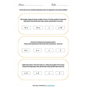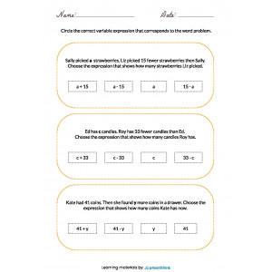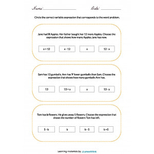 Sometimes the process of solving word problems may be difficult for kids. This activity is a fun way for your kids to overcome these difficulties. Our learning pages provide a set of tasks on each page. Kids need to circle the correct variable expression that corresponds to the word problem. These learning pages are simple enough for kids to use for home learning and online practicing. Students will not know they are learning because they will be having much fun.